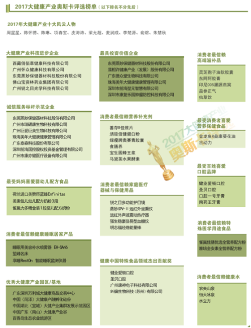 2017年第二屆大健康產業奧斯卡頒獎典禮得到了320家大健康企業的積極參與,本次活動共設置“十大風云人物、大健康產業科技進步企業、高端滋補品、家庭醫療器械與保健用品、誠信服務標桿示范企業、最具投資價值企業、營養補充劑、營養保健食品、嬰幼兒配方食品、特殊醫學用途食品、口腔品牌、健康睡眠居家產品、健康水、大健康產業園區/基地、健康中國特殊食品領域杰出貢獻獎等15個獎項,經過一個多月的評選,共評出優秀企業及個人70個。本次活動旨在樹立大健康產業榜樣力量,帶動行業良性競爭的發展方向,為廣大企業在選擇大健康商品時提供了一份權威的“大健康指南”。