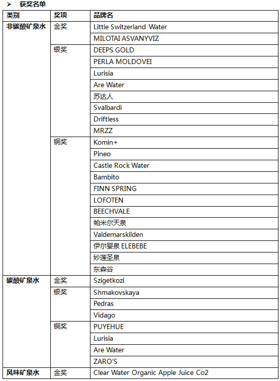 本屆賽事再度與環(huán)球好水協(xié)會強強聯(lián)合,迎來美國、匈牙利、北愛爾蘭、挪威近全球20個國家的優(yōu)質(zhì)水品牌角逐“非碳酸水”、“碳酸水”、“風(fēng)味水”三大獎項。評審團由環(huán)球好水協(xié)會會長邁克爾?馬薩博士聯(lián)同韓國、港澳臺四位品鑒專家組成。