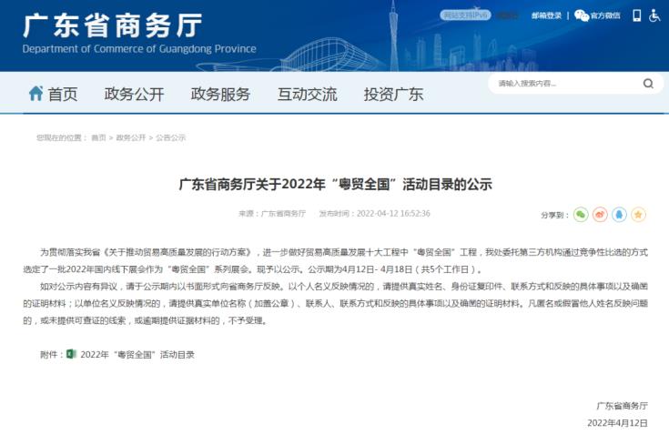 為更好地貫徹落實廣東省《關(guān)于推動貿(mào)易高質(zhì)量發(fā)展的行動方案》,為進一步做好貿(mào)易高質(zhì)量發(fā)展十大工程中“粵貿(mào)全國”工程,幫助廣東省企業(yè)利用展會平臺開拓國內(nèi)市場,廣東省商務(wù)廳委托第三方機構(gòu)通過競爭性比選的方式選定了一批2022年國內(nèi)線下展會作為“粵貿(mào)全國”系列展會。