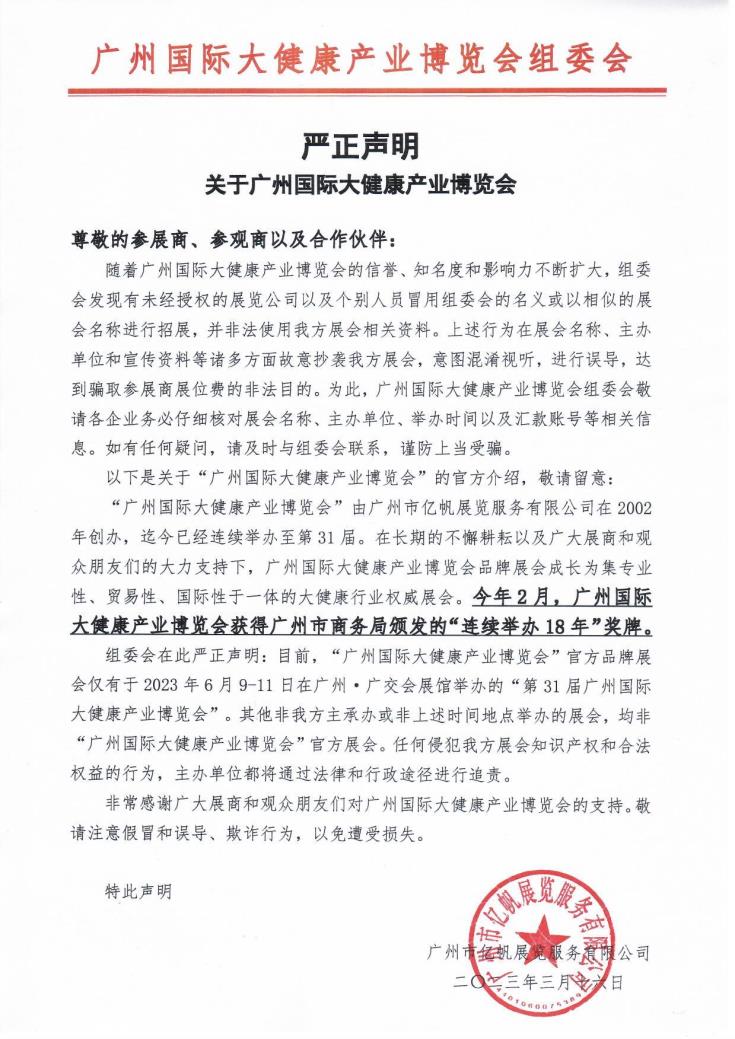 組委會在此嚴正聲明:目前,“廣州國際大健康產(chǎn)業(yè)博覽會”官方品牌展會僅有于2023年6月9-11日在廣州?廣交會展館舉辦的“第31屆廣州國際大健康產(chǎn)業(yè)博覽會”。其他非我方主承辦或非上述時間地點舉辦的展會,均非“廣州國際大健康產(chǎn)業(yè)博覽會”官方展會。任何侵犯我方展會知識產(chǎn)權和合法權益的行為,主辦單位都將通過法律和行政途徑進行追責。