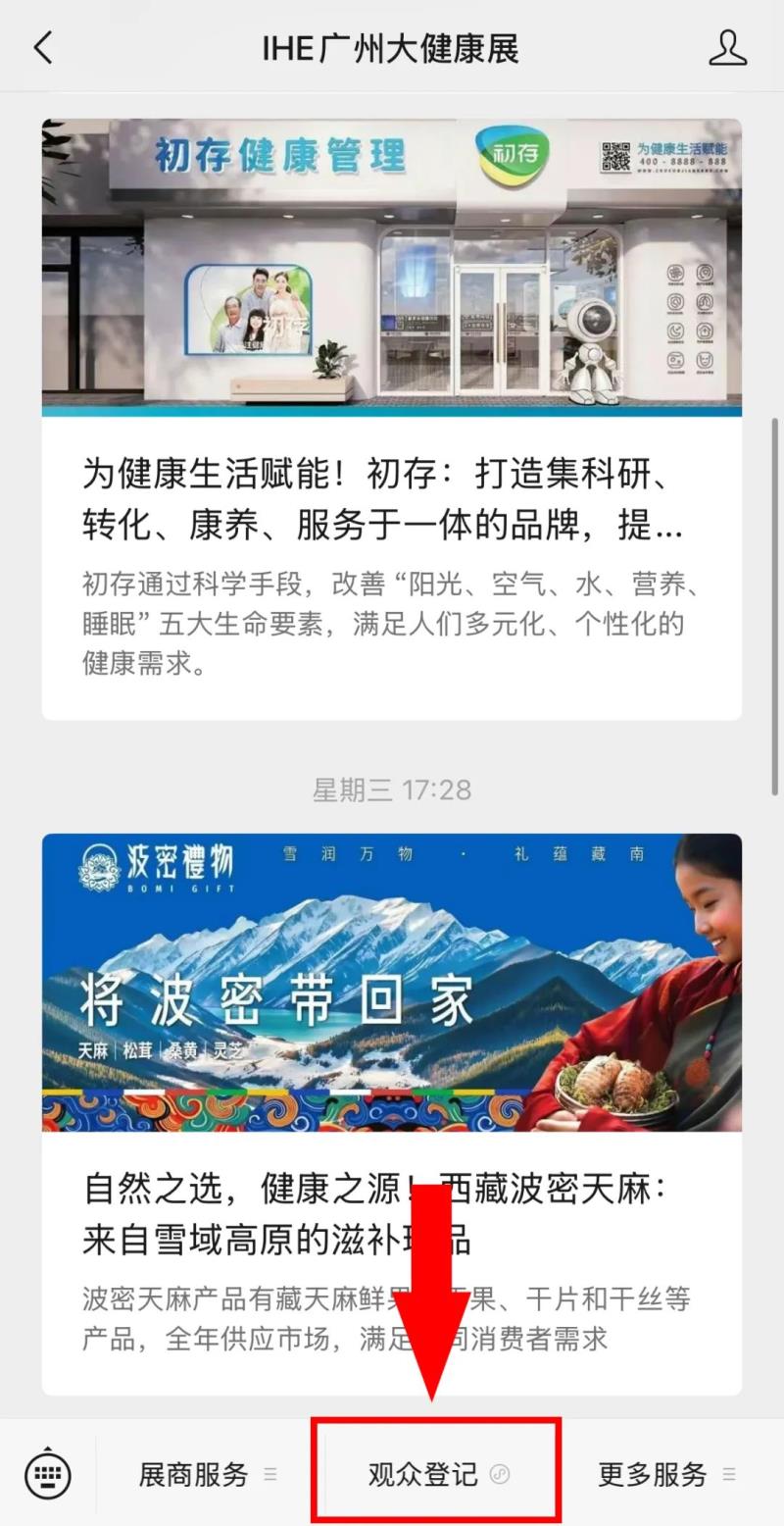 01掃碼關(guān)注公眾號STEP1:掃碼關(guān)注展會公眾號“IHE廣州大健康展”。 |