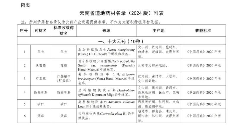 近日,為推動云藥產業高質量發展,云南省農業農村廳等部門共同發布《云南省道地藥材名錄(2024版)的通知》。《通知》共收錄了三七、滇重樓、燈盞花等十大云藥,以及滇黃精、紅花、草果等146種特產藥材。