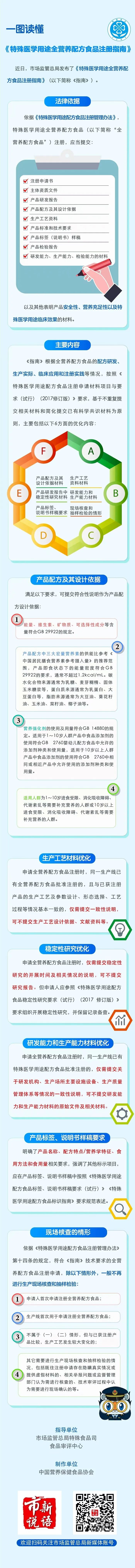 《指南》總結了特殊醫學用途全營養配方食品的產品配方及其設計依據,生產工藝設計材料、穩定性研究材料、研發能力和生產能力材料、產品標簽及說明書樣稿、生產現場核查六大方面內容,為企業申請相關項目做出了詳盡的指引。