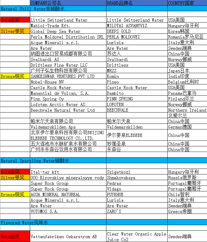 | 非碳酸礦泉水 | Komin、 Pineo、 Castle Rock Water、 Bambito、 LOFOTEN、 FINN SPRING、 BEECHVALE、 帕米爾天泉、 Valdemarskilden、 伊爾嬰泉ELEBEBE、 妙蓮圣泉、 東森谷、 PUYEHUE |