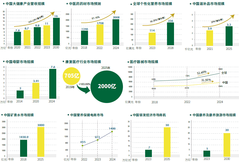 我國大健康產(chǎn)業(yè)正迎來顛覆性的發(fā)展與機(jī)遇。2023年我國大健康產(chǎn)業(yè)市場規(guī)模約為11萬億元,預(yù)計(jì)此數(shù)據(jù)到2030年將達(dá)到16萬億元。